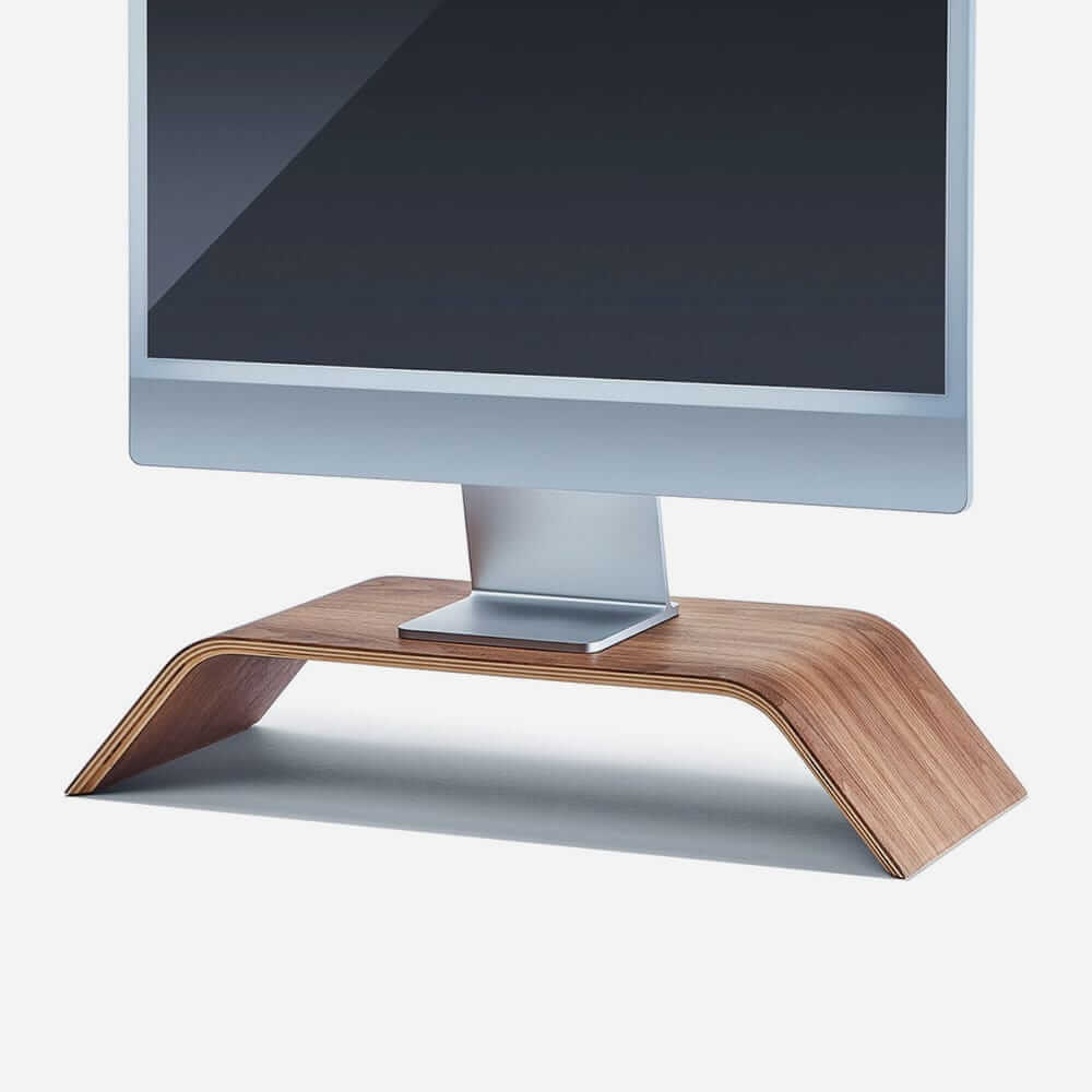 This stylish walnut stand is an ergonomic boost for your posture and your desktop, bringing your monitor to eye level while giving you extra storage space below.