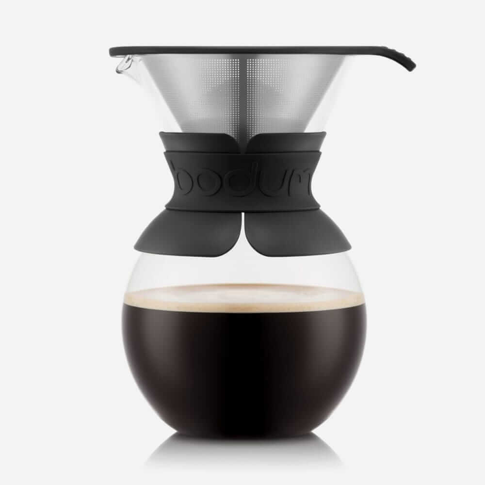 This streamlined pour-over set is made from premium borosilicate glass, with a permanent stainless steel filter and silicone, nonslip heat guard.