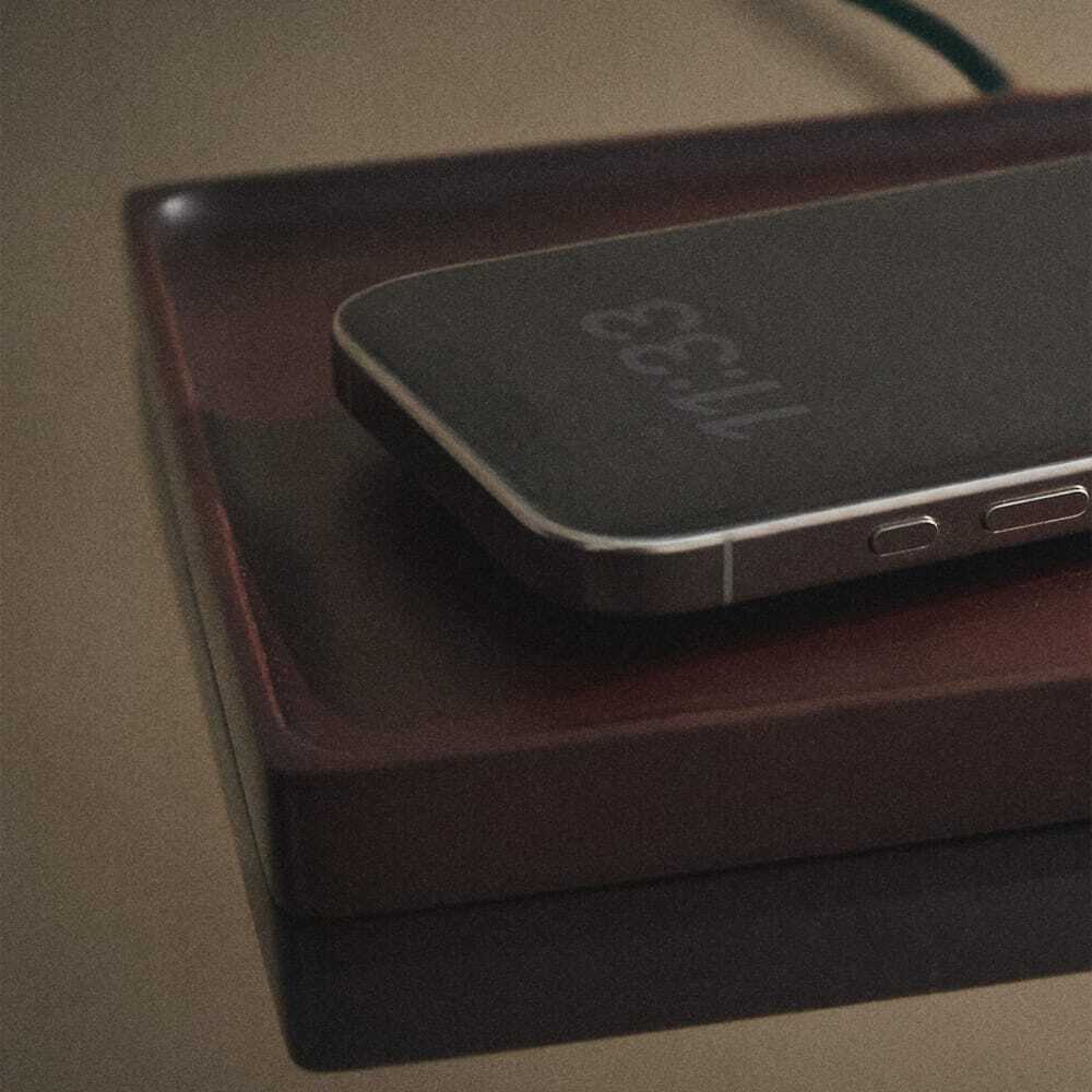 Looks like a simple wooden tray, but will charge your earbuds and phone. Wireless charging tray, |
