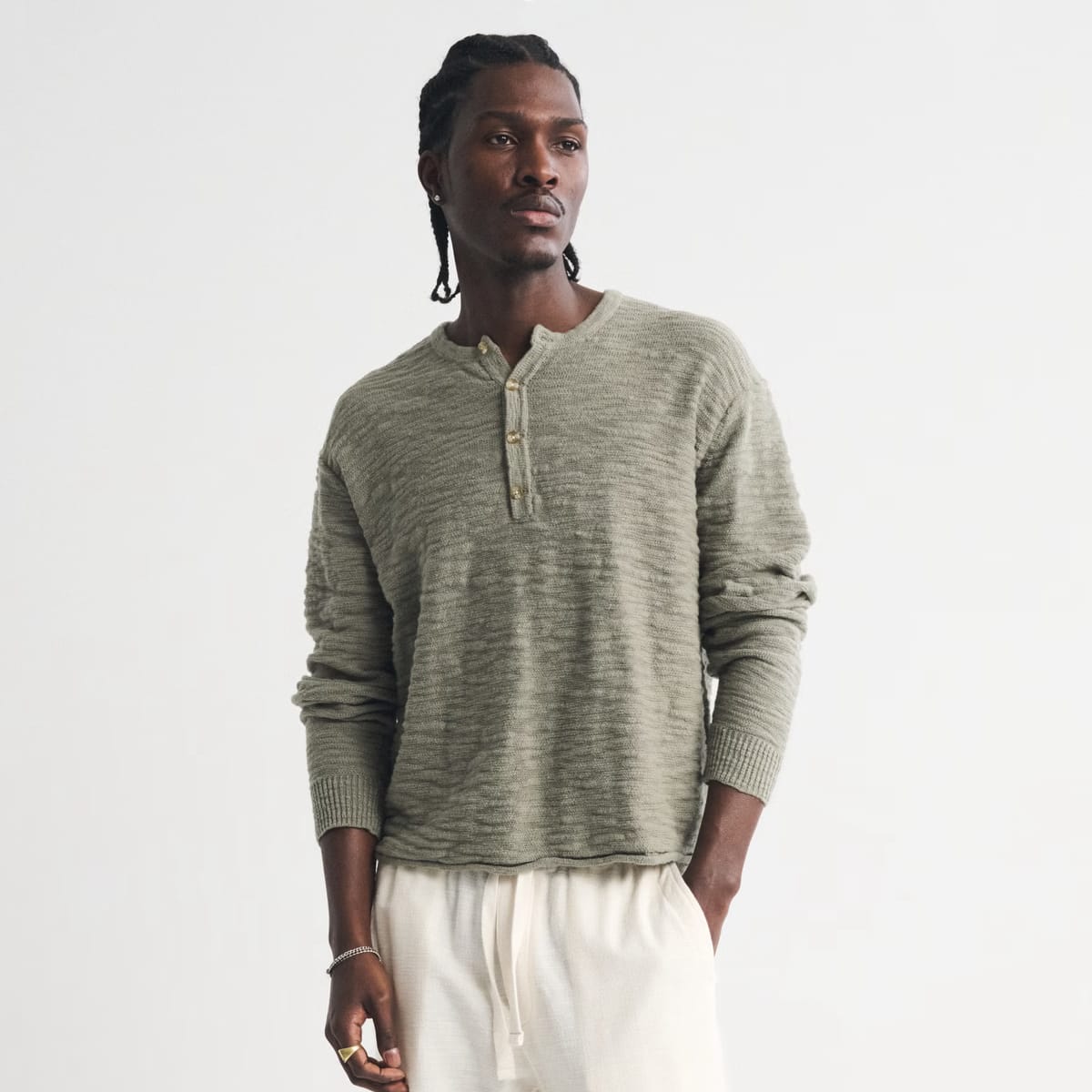 But time has a way of resetting the narrative. After a few years out of the rotation, the henley feels fresh again, largely because the way we wear clothes has shifted. There’s more emphasis now on texture, fabrication and silhouette—areas where the henley, done right, actually excels. It’s no longer about using it as a stand-in for a basic tee; it’s about recognizing its nuance: the subtle ribbing, the soft structure, the way the placket adds just enough visual interest without trying too hard.