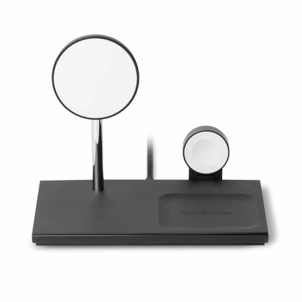 Charge all your tech simultaneously with this 3-in-1 desk organizer, featuring adjustable viewing angles, a detachable watch puck, and a sleek, weighted design for ease of use.