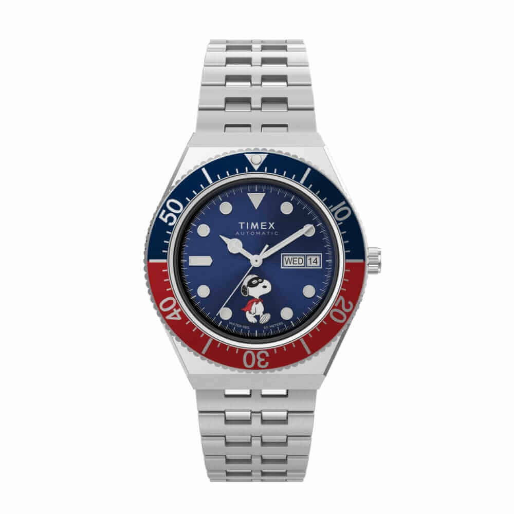 Snoopy takes center stage on the blue sunray dial of Timex's M79 watch. It's got an automatic movement, a retro-inspired stainless-steel bracelet and a limited-time discount.